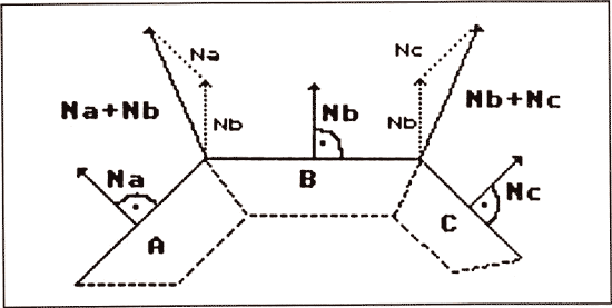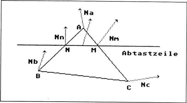 Am einfachsten ist es, wenn wir davon ausgehen, daĂ alle unsere Polygone Dreiecke sind. Wenn nicht, Ă€ndert sich nichts am Prinzip, man muĂ nur schrecklich viele Dinge zusĂ€tzlich beachten. Bleiben wir also bei einem Dreieck. AuĂerdem sollten wir davon ausgehen, daĂ wir uns bereits im Bildschirmkoordinatensystem befinden, am einfachsten ist eine solche Shading-Routine innerhalb des Hidden Surface-Algorithmus zu implementieren. Sehr einfach ist das beispielsweise mit dem z-Buffer. Was wir brauchen, sind erst einmal IntensitĂ€ten fĂŒr jede Seite des Dreiecks. Wir kennen die Normale der FlĂ€che. AuĂerdem liegen um das Dreieck noch andere FlĂ€chen herum, die ebenfalls eine FlĂ€chennormale liabSn. In Bild 8 sehen Sie, was wir tun: Wir berechnen fĂŒr jeden Eckpunkt, an dem sich zwei oder mehr Dreiecke berĂŒhren, eine Mittelwert-Normale, die wir im folgenden als die Normale des jeweiligen Eckpunktes bezeichnen wollen. Da die LĂ€nge der Normalen hier ĂŒberhaupt nicht interessiert, nur die Richtung ist wichtig (im Beleuchtungsmodell wird ja nur der Winkel eines Lichtstrahls zur Normalen verwendet), können wir den Mittelwert der Normalen durch einfaches Addieren der FlĂ€chennormalen erhalten.