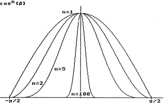 Bild 5: Im Beleuchtungsmodell fĂŒr die direkte Reflektion wird der Streuwinkel durch die Potenz des Cosinus des Winkels zwischen Reflektions- und Sichtvektor bestimmt. GroĂe Werte fĂŒr n ergeben kleine Streuwinkel, was zusammen mit groĂen Reflektionsfaktoren deutliche Schlaglichter ergibt, wĂ€hrend kleine Reflektionsfaktoren matte, papierartig scheinende OberflĂ€chen erzeugen. WĂ€hlt man unterschiedliche Faktoren fĂŒr die drei Grundfarben, kann man gefĂ€rbte Schlaglichter, wie sie z.B. bei Metallen auftreten, erzeugen.