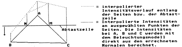 Es ist nun sehr einfach, fĂŒr jede Seite, die von der Abtastzeile geschnitten wird, die IntensitĂ€ten zu interpolieren. Ein Beispiel: Der Punkt A habe die Bildschirmkoordinaten Y=240, fĂŒr Punkt B sei Y=120, fĂŒr Punkt C Y=100. Die Abtastzeile schneidet die Seiten AB und AC bei Punkt N mit dem Y-Wert Yn= 180. Wir kennen die IntensitĂ€ten bei A, B und C. FĂŒr die Seite AB ergibt sich also ein IntensitĂ€tsunterschied dI = Ia-Ib. Insgesamt ĂŒberstreicht die Abtastzeile die Seite AB mit