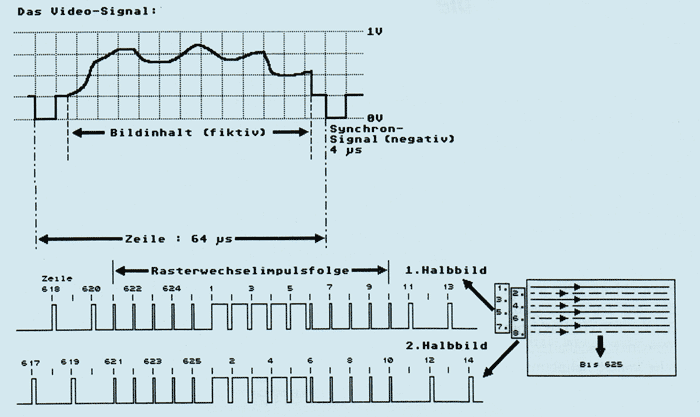 steigert die Zeilenzahl des Videobildes auf das Doppelte, ohne jedoch die nötige Übertragungsbandbreite zu erhöhen. Das Prinzip beruht einfach darauf, daß man in einem Halbbild nur ungerade Zeilen Überträgt und im nächsten Halbbild, um einen halben Zeilenabstand versetzt, nur gerade Zeilen. Daraus resultiert, daß es jetzt zwei Halbbilder mit einmal 313 und einmal 312 Zeilen gibt. Der Rasterwechselimpulsfolge wird dabei die Aufgabe übertragen, ein Halbbild dem anderen gegenüber jeweils um einen halben Zeilenabstand zu versetzen. Das brachte natürlich Nachteile, denn eine einzige Zeile wird jetzt nur noch mit 25 Hz ‘aufgefrischt’, die benachbarte Zeile jedoch gleich darauf und damit das ganze Bild wie gehabt mit 50 Hz. Das damit erkaufte Flimmern benachbarter Zeilen zueinander konnte bei normalen ‘Fernsehbildern’ und aufgrund der zeitlichen Integrierwirkung des menschlichen Auges vernachlässigt werden. Bild 2 soll diese Zusammenhänge noch etwas anschaulicher darstellen.
