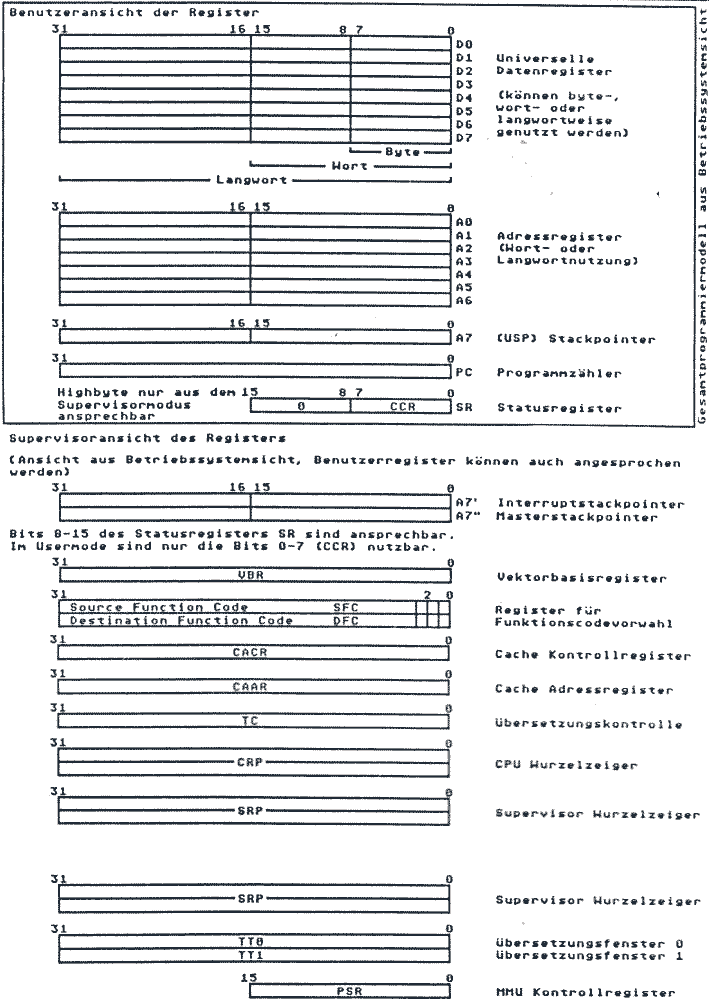 Da die meisten nicht über weitgehende Erfahrungen bei der Programmierung des 68020 verfügen, soll hier ein Vergleich zum 68000 gezogen werden. Die weitgehende Kompatibilität zum 68000 beruht auf der Tatsache, daß der Objektkode und der Registeraufbau aufwärtskompatibel zum 68000 sind. Für den Benutzer präsentieren sich beide Prozessoren fast identisch. Die entscheidenden Änderungen werden erst im Supervisormodus sichtbar - also aus der Sicht der Programmodule des Betriebssystems. Nur das Betriebssystem hat Zugriff auf diese Zusatzregister. Zwei Register dienen der Adressierung und Veränderungen im Cachespeicher. Auch die Abschaltung des Cache ist möglich. Weitere zwei Register sind für die zwei transparenten Fenster der MMU vorgesehen. Bei Betrieb der MMU geben sie Adressbereiche an, in denen auf den Einsatz der MMU verzichtet werden soll. Bei Einsatz der MMU zeigen zwei Zeiger, je einer für Usermodezugriffe und einer für Betriebssystemzugriffe, auf die Basis der Umrechnungstabellen für die MMU, die frei im Speicher liegen können. Außerdem dienen der MMU ein Statusregister und ein Kontrollregister. Ebenfalls in der virtuellen Speicherverwaltung begründet sich das Vektorregister, das die Basisadresse für die Ausnahmevektoren festlegt. Bei Ausnahmen wird es als Offset zur Vektornummer addiert. Was noch fehlt sind die Stackpointer, die beim 68030 getrennt für Interrupts und sonstige Betriebssystemfunktionen ausgeführt sind. Ansonsten besteht natürlich sehr viel Ähnlichkeit zu den anderen Prozessoren der 68xxx-Reihe. Die Befehlsausführung wurde zur Vereinfachung der Prozessorentwicklung in zwei Schritte geteil: Zuerst wird entsprechend dem Befehl eine Befehlsfolge aus dem Mikro-ROM ausgelesen. Diesen Befehlen sind solche im NanoROM zugeordnet. Diese werden danach abgearbeitet und in Schaltimpulse an die Prozessorhardware umgesetzt.