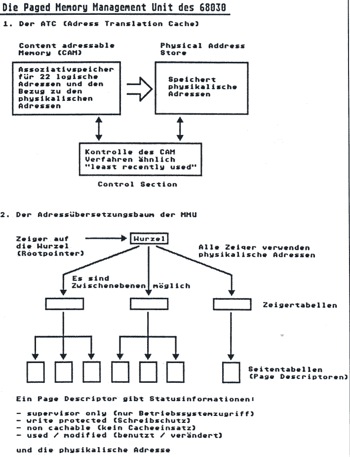 Was für den 68020 als Coprozessor erhältlich ist, nämlich eine MMU, wurde beim 68030 gleich integriert, denn alle komplexeren Betriebssysteme, insbesondere UNIX, sind vom Vorhandensein eines solchen Bauelementes abhängig. Was auf den 8-Bit Computern die statische Speicherverwaltung war und auf den 16-Bitem die dynamische Speicherverwaltung ist, das ist bei 32-Bit-Prozessoren und entsprechenden Betriebssystemen die MMU. Eine MMU = ‘Memory Management Unit’ verwaltet den Speicher. Sie sorgt für größere Portabilität der Programme. Bei Betriebssystemen, die mehrere Benutzer und gleichzeitig laufende Programme (Multitasking) erlauben, muß gewährleistet sein, daß sich Programme nicht gegenseitig stören. Außerdem hilft die MMU, falls ein Programm größer ist als der Speicher. Auf dem 68030 lassen sich Programme schreiben, die grundsätzlich von 4 Giga Byte vorhandenem Hauptspeicher ausgehen. Wird nun vom Programm ein entsprechender, nicht real vorhandener Speicherbereich adressiert, so meldet die MMU dies und hilft dem Betriebssystem diesen Speicherbereich, falls er nicht real existiert, zur Verfügung zu stellen. Dies geschieht so: Bei allen Speicherzugriffen wird die vom Programm erzeugte sogenannte virtuelle Adresse von der MMU in eine reale Speicheradresse umgesetzt. Eine vom Programm angegebene logische Adresse 0 kann also durch die MMU an fast beliebiger Stelle im Speicher liegen.