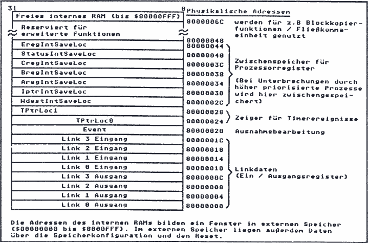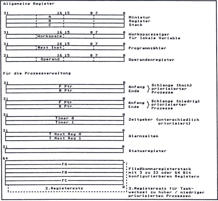 Interessant beim Multitaskingkonzept innerhalb der Transputer ist die Tatsache, daß Register - auch die der Floating-Point-Einheit - bei einem Wechsel von einer niedriger zu einer höher priorisierten Task automatisch gerettet werden.