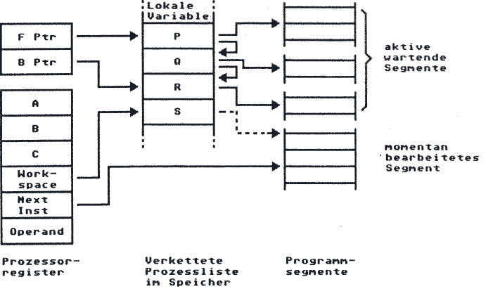 Neben der normalen Befehlsbearbeitung kann der Transputer noch einiges mehr. Beispielsweise unterstützt er Multitasking bereits hardwaremäßig. Das Programmodul, welches normalerweise für den Taskwechsel sorgt, der Scheduler, wurde einfach hardwaremäßig integriert. Eine verkettete Liste enthält Zeiger auf ausführbare Programm Segmente. Zwei Prozessorregister zeigen auf das Ende und den Anfang dieser Liste. Im Beispiel warten die Prozesse P, Q, R auf Ausführung, S wird momentan ausgeführt. Falls ein Prozeß auf eine Eingabe/Ausgabe über Links wartet o.ä., reserviert der Scheduler automatische keine Zeit mehr für ihn. Für den Scheduler ebenfalls notwendig sind Timer. Davon gibt es wie von den Prozeßlisten zwei: einen für höher und einen für niedriger priorisierte Prozesse.