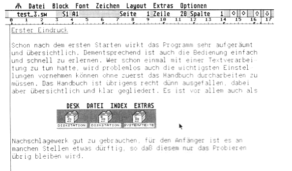 Wenn man mit dieser Behinderung leben kann, und das sollte nicht so schwer fallen, dann ist START WRITER ST eine ausgezeichnete Textverarbeitung, die kaum Wünsche offen läßt. Ich habe mich auf jeden Fall für diese Textverabeitung entschieden und seit ihrem Eintreffen keine andere mehr angerührt.
