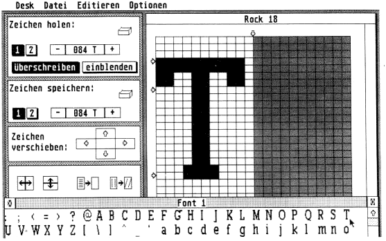 Es ist möglich in einem Dokument bis zu 20 verschiedene Zeichensätze zu verwenden. Einige interessante Fonts sind bereits vorhanden. Man kann sich aber auch eigene mit dem komfortablen Fonteditor entwerfen. In einem 30x18 Raster entwirft man die einzelnen Zeichen für den Bildschirmfont. Dabei werden auch Angaben über die Breite der Zeichen für die Proportionalschrift gemacht.