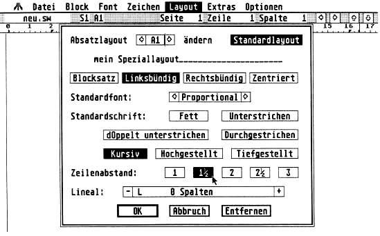 Das Absatzlayout ist mehr auf den jeweiligen Absatz ausgerichtet und bestimmt die Ausrichtung des Textes, den Standardfont, den Zeilenabstand, die Tabulatoren und die Absatzbreite. Bei der Eingabe der Breite muß man jedoch wieder darauf achten, daß sie nicht größer als die Seitenbreite ist, denn sonst wird beim Ausdruck kompromißlos abgeschnitten. Das gleiche gilt nebenbei auch für die Spalteneinteilung. Es bleibt die Aufgabe des Benutzers, die Spalten mit sinnvollen Werten zu belegen, damit es beim Druck keine Überraschung gibt.