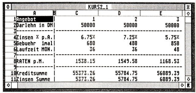 Jetzt können Sie Ihren CD-Player wieder ausschalten! Der Streß ist vorbei, aber eine Hausaufgabe muß ich Ihnen leider noch aufbrummen, um im nächsten Teil etwas zügiger voranzukommen, denn aus den vielen Briefen ging auch hervor, daß die MACRO-Sprache gerne gesprochen werden soll und wir deshalb dieses Thema in unsere Anwendung mit einbauen werden. Bitte bauen Sie Ihr Arbeitsblatt KURS2.WKS nach Bild 5 auf.