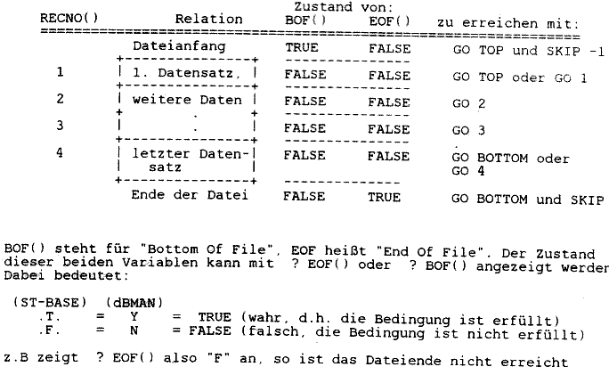 Diese Nummer ist ja bekanntlich über die Variable RECNO() abrufbar. Befindet sich der Zeiger ganz am Anfang der Tabelle (noch vor dem ersten Datensatz), so wird gleichzeitig die logische Variable (Schalter) BOF() wahr, d.h. ihr Zustand ist TRUE. Für das Dateiende gibt es den Schalter EOF(), der durch seinen logischen Wert TRUE auf das Ende der Relation hinweist, d.h. es sind keine weiteren Sätze enthalten. EOF() wird erst nach dem Lesen des letzten Satzes wahr. Diese Variablen sind besonders bei er Programmierung wichtig, damit ein Programm nicht mit einer Fehlermeldung abbricht, weil z.B. über das Dateiende gelesen wurde (Bild 1 zeigt den Zusammenhang).
