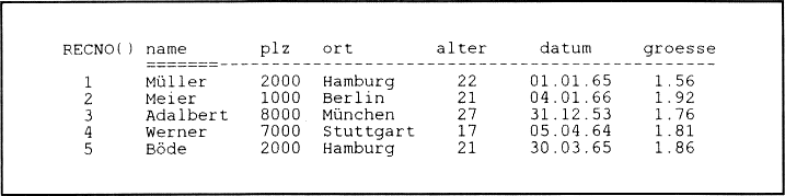 Mit “USE datei INDEX index3, index1,index2" kann das Ergebnis der Operation betrachtet werden. Die Datei ist primär nach Orten sortiert. Innerhalb des Ortes sind die Namen in aufsteigender Reihenfolge. Ist eine absteigende Sortierung gewünscht -kein Problem, INDEX ON ... TO ... DESCENDING erledigt auch dieses Problem.