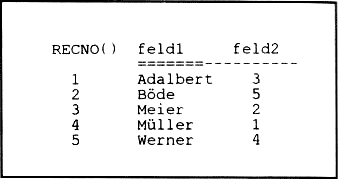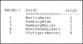 In (feld2) sind nur die Datensatznummern der zugehörigen Datensätze gespeichert. Das System durchsucht mit SEEK die sortierte Relation und kann bei Bedarf mit Hilfe des Inhalts aus (feld2) auf den kompletten Datensatz zugreifen.