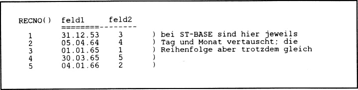 Weiterhin muß beachtet werden: eine indizierte Relation befindet sich logisch in einer anderen Reihenfolge. Deshalb ist nicht gewährleistet, daß mit "GO 1" der Dateianfang gefunden wird. Man sollte bei indizierten Tabellen auf die Befehle GO TOP bzw. GO BOTTOM ausweichen, die stets an die Grenzen der Datei gelangen, unabhängig von der Datensatznummer.