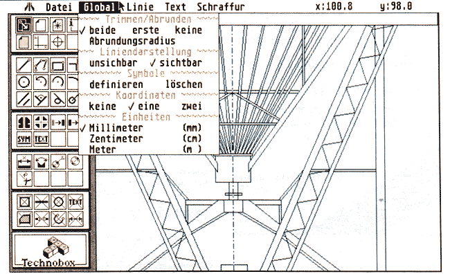 Die nächste Gruppe bilden die Funktionen, die sich jeweils auf einen definierten Bereich auswirken. Die Funktion Spiegeln ist hierbei die einfachste; beim Kopieren und Verschieben kann zusätzlich noch ein Vergrößerungsfaktor bestimmt werden. Am leistungsfähigsten ist das Rotieren, denn hier kann neben dem Rotationswinkel noch die Anzahl der Kopien vorgegeben werden, so daß hiermit sehr einfach komplexe Operationen ausgeführt werden können. Ebenfalls in dieser Gruppe ist der Text-Befehl, mit dem Texte in die Zeichnung eingefügt werden können. In einem speziellen Menü lassen sich dafür die Texthöhe, der Ausrichtungswinkel (0’-360’) und einige Schriftattribute setzt.