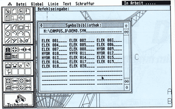 Wenn man Zeichnungen erstellt, kommt es häufig vor, daß man die gleichen Elemente mehrmals benötigt. Deshalb ist es praktisch und zeitsparend, wenn man diese Elemente festlegen und speichern kann, so daß sie auf Tastendruck zur Verfügung stehen. Um ein Symbol zu erstellen, zeichnet man es und rahmt diesen Bereich ein. Dieses Element wird dann unter einem beliebigen Namen in einer Symboldatei abgespeichert und steht dann in einer Auswahlbox zur Verfügung.