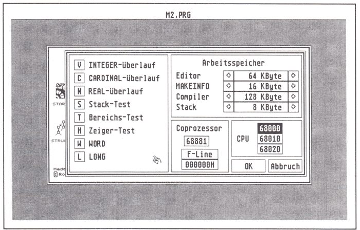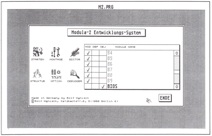 Eine weitere Unsitte bei den Modula-Compiler auf dem ST sind eigene Spracherweiterungen. Das Hinzufügen eines STRING-Typs z.B. ist nicht einfach ein “Feature” des Systems, es ist vielmehr eine grundlegende Änderung der Sprache an sich. Das gleiche gilt für einen eingebauten Assembler. Erweiterungen gehören in eigene Module. Wenn sich Routinen nur schlecht als Prozeduren formulieren lassen, z.B. wegen wechselnder Parameteranzahl, muß man eben Modula-Tricks anwenden oder das Konzept überdenken. Ein Wildwuchs von Designänderungen kann der Sprache nur schaden und nutzt das Modul-Konzept nicht aus.