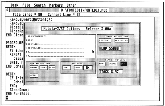 Der mitgelieferte Editor unterstützt die Entwicklung von Modula-Programmen besonders. Die “Language-Support”-Option bewirkt, daß alle in Kleinbuchstaben eingegebenen Wörter möglichst früh in Modula-Schlüsselworte umgewandelt werden. Um “PROCEDURE” einzugeben, reichen dann schon die Buchstaben “pr”.