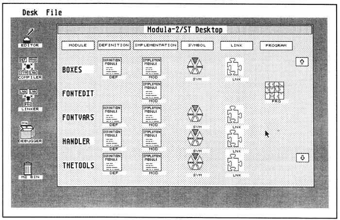 Modula-2 ist der Nachfolger von Pascal (das sich auf dem ST erstaunlicherweise nicht durchsetzen konnte) und ebenfalls von Niklaus Wirth entworfen. Ein zentrales Konzept der Sprache ist die Modularisierung. Programme werden nicht an einem Stück notiert oder in Include-Dateien aufgeteilt, sondern mit Hilfe von Modulen auch logisch zerlegt. Dabei stellt ein Modul der Außenwelt Objekte wie Prozeduren oder Typen zur Verfügung. Ein Modul, das ein anderes importiert kann diese Objekte benutzen, ohne deren Implementierung zu kennen. Eine Änderung der Implementierung einer importierten Routine verändert das importierende Programm nicht. Solange die Schnittstelle gleich bleibt, muß lediglich neu gelinkt werden. Der Compiler überprüft die Einhaltung der Schnittstelle, vor allem Typübereinstimmungen, sehr penibel.