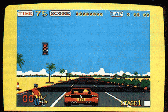 Wollten Sie nicht immer schon einmal einen Ferrari Testarossa fahren? In OUT RUN von U.S Gold haben Sie die Möglichkeit dazu. Mit einem hübschen Mädel an der Seite rast man unter Zeitdruck über einen amerikanischen Highway und überholt Käfer, Lastwagen und andere Verkehrsteilnehmer. Während der Bewältigung verschiedener Strecken erklingt eine packende Melodie. Sie stimmt den Spieler auf die Lust nach grenzenloser Freiheit ein.