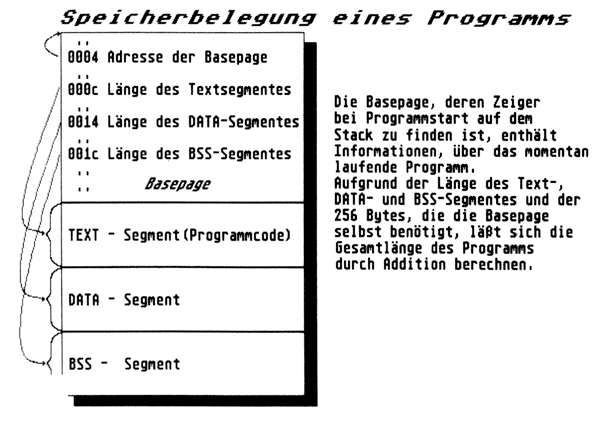 Den Bereich der schon mit Werten vorbelegten Variablen nennt man DATA-Segment, BASIC-Fanatiker werden gewisse Ähnlichkeiten zu DATA-Zeilen erkennen, während der zweite Bereich als BSS-Segment bezeichnet wird. BSS bedeutet Block-Storage-Segment (eigentlich ist das zweite s und das Wort Segment doppelt gemoppelt, aber was soll’s, es hat sich so eingebürgert, also bleiben auch wir dabei), da in ihm die Angabe über das Organisieren größerer Blöcke im Speicher zu finden sind. Wir wissen also, daß unser Programm im Speicher aus einem TEXT-Segment, das nicht, wie man vielleicht denken könnte, die Ausgabetexte des Programms sondern den eigentlichen Programmcode enthält, einem DATA-Segment, welches vordefinierte Variablen- auch Programmtexte - beinhaltet und einem BSS-Segment besteht. Wenn das BSS-Segment im Speicher des Rechners vorliegt, verbraucht es natürlich den vordefinierten Speicherplatz der gewünschten Puffer (beispielsweise unsere oben erwähnten 1 Megabyte).