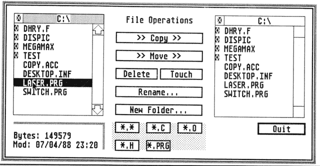 Wer mit einer Floppy arbeitet, kann sich bei Laser C die RAM-Disk sparen. Wenn erst einmal alles im Speicher ist, hat die Floppy nichts mehr zu tun. Man kann angeben, welche Programme gleich nach dem Start in den Speicher geladen und dort resident gemacht werden sollen. Die Quelltexte und Objektdateien werden automatisch in den Cache geladen und von dort aus verwendet. Die Cache-Logik ist der Schlüssel zu den superschnellen Turn-around-Zeiten von Laser C. Um Geschwindigkeit zu erreichen, muß man meistens Kompromisse eingehen, so auch bei dem Cache von Laser C. Das Programm ist nicht mehr unabhängig von der TOS Version. Es werden zwar alle bisher bekannten Versionen unterstützt, aber es kann mit neueren Versionen Probleme geben. Oliver Joppich von Application Systems /// Heidelberg versichert jedoch, das die Anpassung auf ein neues TOS im Configurationsfile der Shell erfolgen kann und kein teures Update erfordert.
