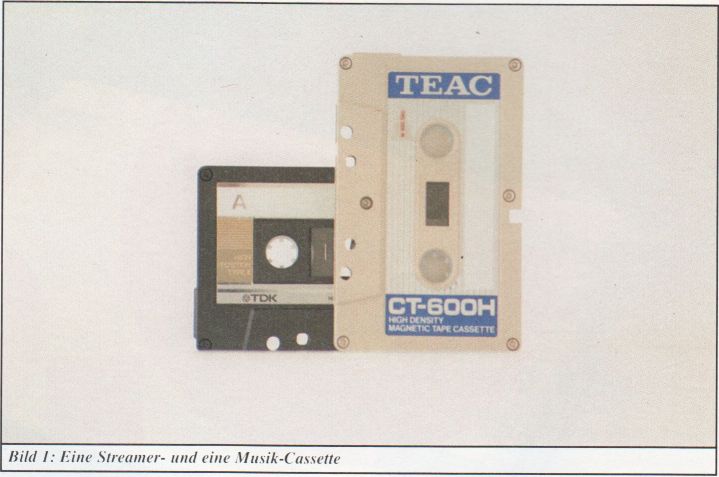 Rhothron verwendet bei den Streamern, die ich testen konnte, allerdings wiederum andere Cassetten. die tatsächlich wie normale Musik-Cassetten aussehen (siehe auch Bild 1). Auf den zweiten Blick findet man doch noch Unterschiede, nämlich den Schreibschutzschieber (langsam aussprechen und auf der Zunge zergehen lassen) und eine asymmetrisch an der oberen Kante liegende Kerbe, die diese Bänder markiert und verhindert, daß die Cassetten verkehrt herum eingelegt werden. Streamer-Cassetten kann man nicht im Laufwerk umdrehen, wie Sie das etwa mit Ihrer Dire-Straits-Aufzeichnung in Ihrem Radiorecorder machen können, wenn Sie feststellen. daß Sie eigentlich doch lieber Nicki hören. Musik-Cassetten haben diese Kerbe nicht, und deswegen kann man sie auch nicht in einen Rhothron-Streamer schieben. Modern Talking müssen Sie also schon irgendwie anders digitalisieren.