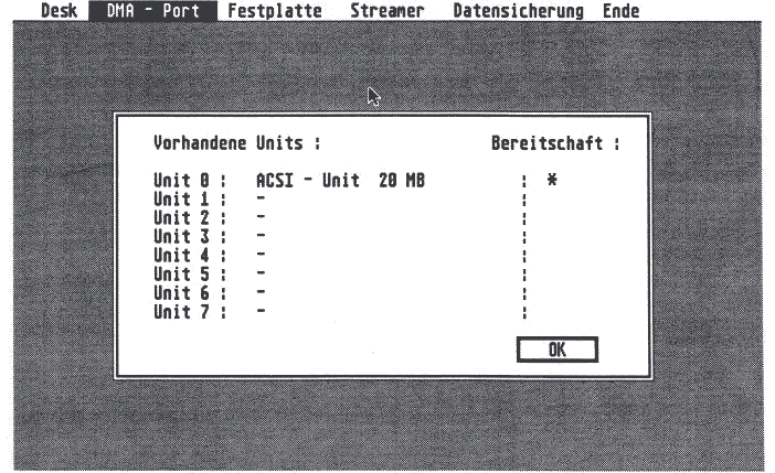 Die Software präsentiert sich im hehren GEM-Gewande. Beim Start schnappt sich das Programm den gesamten verfügbaren freien Speicher, um ihn später zum Kopieren verwenden zu können. Dann werden alle Geräte am DMA-Bus durchgeprüft, was recht lange dauert (sieht so aus, als sei da eine unnütze und nervende Warteschleife versteckt!). Eine Dialogbox konfrontiert einen dann mit der bitteren Wahrheit über den DMA-Bus (Bild 3).