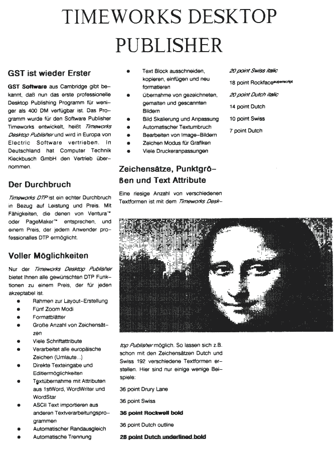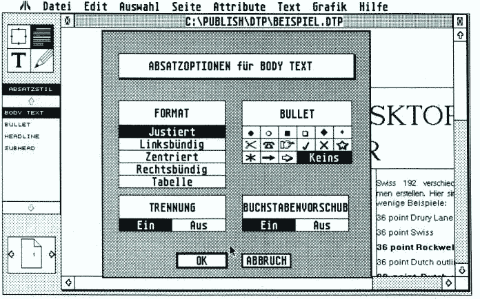 Die wohl häufigste Tätigkeit in einem DTP-Programm hat mit dem Layout von Texten zu tun. Die wichtigsten Funktionen des Programms haben also mit den Design-Möglichkeiten für Texte zu tun. Hierbei wiederum das Wichtigste sind die Zeichensätze. Im Moment stehen 5 Zeichensätze zur Verfügung. Davon sind 2, Swiss und Dutch (Times-ähnlich), in Größen zwischen 7 und 72 Punkt vorhanden, Rockface nur in 20 und 40 Punkten, ein weiterer Schrifttyp, der nur aus gestylten Großbuchstaben besteht, in 20 bis 40 Punkten, sowie ein Sonderzeichensatz mit ungefähr 20 Symbolen in Größen zwischen 7 und 70 Punkten. Jeder der Fonts enthält auch die internationalen Sonderzeichen. Diese Schriften können jeweils in einer ganzen Reihe von Textstilen dargestellt werden: fett, kursiv, unterstrichen, hell, invers, umrandet und hoch-und tiefgestellt.