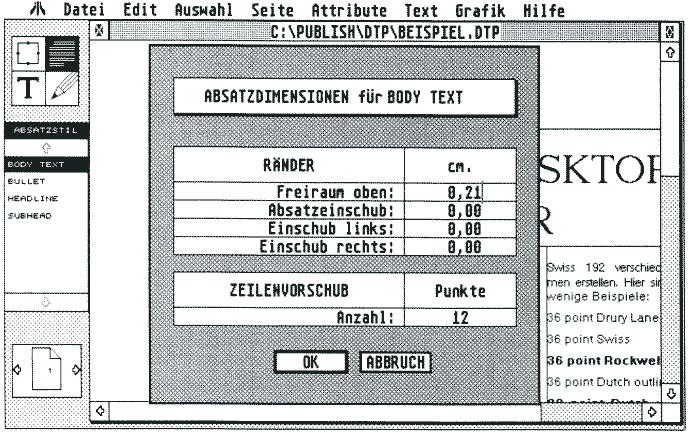 Die Absatzformate helfen bei der Arbeit an einem Layout sehr, besonders, wenn viele Seiten in einem durchgängigen Stil gestaltet werden müssen. Man kann sich dann zum Beispiel ein Absatzformat für Überschriften, eines für Unterüberschriften, eines für den eigentlichen Text, eines für Registerseiten usw. konstruieren. Bevor man dann beginnt, den Rahmen mit dem dafür vorgesehenen Text zu füllen, braucht man nur das gewünschte Absatzformat zu wählen und schon erhält der Text das entsprechende Styling. Damit muß man nicht jedesmal alle Parameter neu einstellen. Vorbereitete Parameter anwählen, schon fertig. Auch wenn Sie öfter ähnliche Druckschriften erstellen müssen, hilft diese Möglichkeit: Sie können die Absatzformate abspeichern und dann für weitere Dokumente verwenden. Ansonsten stellt der Timeworks Publisher noch die üblichen Text-Funktionen Suchen und Ersetzen zur Verfügung. Beliebige Textblöcke können ausgeschnitten oder kopiert und wieder eingeklebt werden.