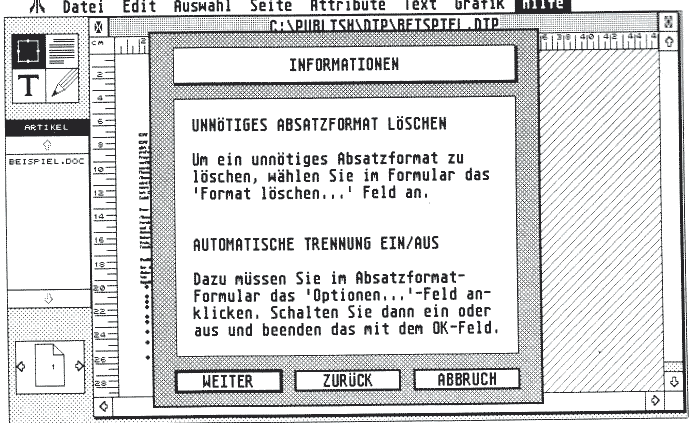 Für das Layout gibt es ebenfalls einige Hilfen: Die Bemaßung des Dokuments kann in Picas und Punkten, Zentimetern oder Zoll (l/8tel oder l/10tel Teilung) dargestellt werden, ein Lineal kann man sich auch einblenden lassen, damit man immer die richtigen Stellen im Dokument trifft. Da der Atari-Bildschirm leider zu klein ist, um eine ganze Seite gleichzeitig auf den Bildschirm zu bekommen, gibt es verschiedene Verkleinerungsmöglichkeiten. So kann man sich bis zu zwei Seiten in Ganzseitendarstellung auf dem Bildschirm zeigen lassen. Auch halbe oder doppelte Originalgröße ist möglich. Mir persönlich fehlt eine Funktion, die das Dokument genau soweit verkleinert, daß eine Dokumentbreite auf den Bildschirm paßt.