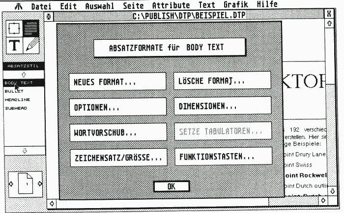 Absatzformate lassen sich auf Funktionstasten legen, so daß man für den Aufruf nur eine Funktionstaste zu drücken braucht.Die Textformatierung ist mit verschiedenen Parametern steuerbar: Man kann den maximalen und minimalen Abstand zwischen zwei Worten, der bei der Blockformatierung entstehen darf, setzen, sowie eine Zone am Zeilenende definieren. in der die Trennung aktiv ist. Bei der Blockformatierung kann man wählen, ob Leerräume außer zwischen Worten auch zwischen den Buchstaben einzelner Worte eingefügt werden sollen, wodurch die Leerzeichen zwischen den Wörtern kleiner werden, dafür aber die Schrift leicht gesperrt wirkt. Dieses automatische ‘Keming’ kann jederzeit durch eine manuelle Kerning-Funktion verändert werden: Der Abstand zwischen beliebigen Buchstaben läßt sich in einer Dialogbox verändert werden.