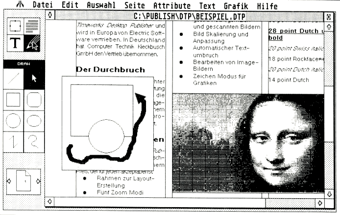 Besonders schön beim Timeworks Publisher ist die Idee des Absatzformates. Damit kann man Texte wirklich schnell ‘in Form’ bringen. Auch die Trennhilfe funktioniert sauber und gut, was man von der des Publishing Partners nicht unbedingt behaupten kann. Übrigens verwendet die Trennhilfe ein ASCII-Lexikon, das den Eindruck macht, als könnte man es leicht selbst ergänzen. Die Grafikmöglichkeiten sind gut und leicht zu handhaben. Gerade Geschäftsgrafiken oder andere ‘einfache’ Illustrationen und Diagramme lassen sich schnell und leicht erstellen, ohne daß erst ein spezielles Grafikprogramm benötigt wird. Gegenüber Grafiken aus Malprogrammen hat die Vektorgrafik den Vorteil, daß sie auf Druckern mit höherer Auflösung auch in besserer Qualität wiedergegeben werden kann.
