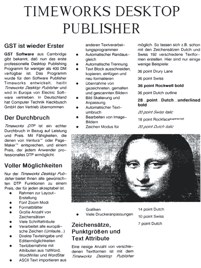 GST ist wohl jedem Atari-Benutzer bekannt, das englische Softwarehaus ist schließlich für das Textprogramm Ist Word verantwortlich, unter dem wir alle zu leiden haben. Aber trotz seiner Macken gibt es immer noch keine vernünftige Alternative zu 1st Word plus. Viele haben sich gewundert, warum von GST schon so lange nichts mehr über Updates und Fehlerkorrekturen zu hören war. Gerüchte behaupteten, GST arbeite jetzt an einem DTP-Programm und das habe eben Priorität. Die Gerüchte hatten Recht - der Timeworks Desktop Publisher wurde von GST für Timeworks Inc. entwickelt. So gut wie der Ventura Publisher oder PageMaker will der Timeworks Desktop Publisher sein. Wirklich?