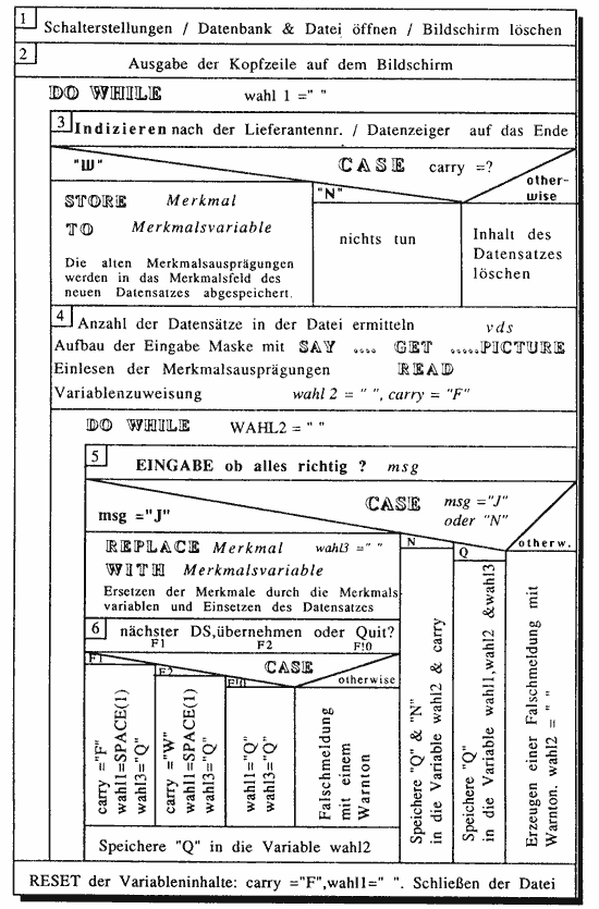 Es werden dann verschiedene Fälle untersucht. Einerseits werden die alten Merkmalsausprägungen in die Merkmalsfelder eines neuen Datensatzes abgespeichert, wenn ein Datensatz erfaßt wurde. Beim erstmaligen Erfassen wird dieser Fall abgewiesen, da die Variable CARRY im Menü auf “F" gesetzt wurde. Andererseits wird der Inhalt des letzten Datensatzes gelöscht und die Variablen für die Merkmalsausprägungen deklariert.