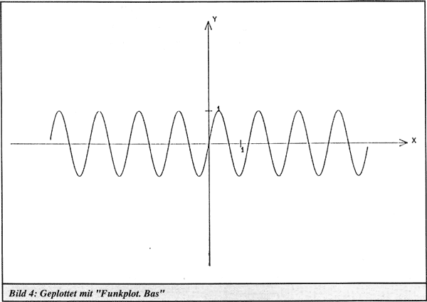 Nachdem das Koordinatensystem fertig ist, beginnt die eigentliche Aufgabe des Programms. In den Variablen ‘Xs’ und ‘Xe’ stehen Start- und Endwert des Plots auf der X-Achse. Die Variable ‘Auf!’ legt die Auflösung fest, d.h. die Schrittweite in Punkten pro Millimeter, in der die Funktion betrachtet werden soll. In der Schleife werden die Funktionswerte berechnet und der Plotter mit dem ‘PA’-Befehl jeweils an diese Stelle positioniert. Der Stift wird abgesenkt und so werden die Punkte Schritt für Schritt miteinander verbunden. Als praktisch erweist sich der Umstand, daß der Plotter Y-Werte, die außerhalb des Zeichenbereichs liegen, sorglos übergeht.
