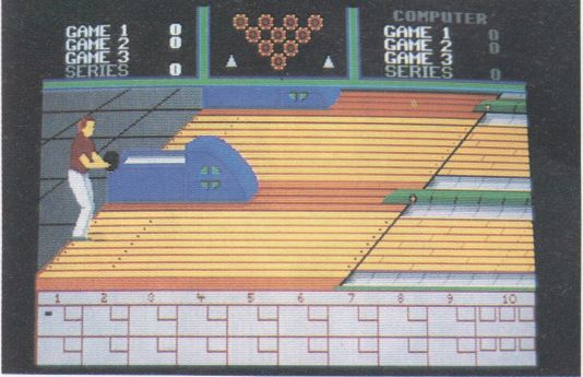 Die Bowlingdisziplin besteht aus 2 Spielteilen. Zuerst sieht man die Abwurfphase und danach die Phase, in der die Kugel auf die Bahn rollt und die Kegel umwirft (das sollte sie zumindest). Die Grafik ist in der ersten Phase in drei Teile unterteilt. Ganz unten ist eine Art Notizzettel zu sehen, auf dem Ihre Punkte festgehalten werden. In der Mitte sieht man den Bowler mit der Kugel in der Hand, und darüber befindet sich eine schematische Darstellung der Kegel. Man bewegt den Spieler jetzt auf der Bahn nach oben oder unten und bestimmt so, wo die Kugel auf der Bahn auftreffen soll. Jetzt drückt man den Feuerknopf. Der Bowler nimmt mit herrlicher Animation Anlauf. Betätigt man nochmals den Feuerknopf, rollt die Kugel los. Ist sie ordungsgemäß abgeworfen, wechselt das Bild. Die Grafik ist nun zweigeteilt. Im unteren Teil sieht man. wie die Kugel auf die Kegel trifft. Im oberen befindet sich ein Ausschnitt aus dem Notizzettel und ein Gesicht, das sich, je nachdem, wie der Wurf gelungen war, verzieht. Hat man das Spiel beendet, gelangt man wieder ins Menü zurück.