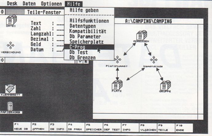 Neben einer alphabetischen Auflistung aller PROG-Funktionen findet man hier auch ein Schaubild über Funktionszustände der Datenbank. Dieses Schaubild ist sehr wichtig. Aus ihm geht hervor, zu welchem Zeitpunkt ein Zugriff auf die Datenbank neu initialisiert werden muß, oder welche Funktionen auf einen Satz positionieren. Anhand kurzer Programmierbeispiele wird sehr schön das Zusammenspiel verschiedener Datenbankfunktionen erläutert. Es werden detailliert die Strukturen der Datenfiles und Schlüsselfiles offengelegt. Es werden ausführlich Begriffe wie Merkmalsnummer, Sortiermerkmal oder Datensatzvariable erläutert. Die PROG-Bibliothek bietet einen großen Umfang an Funktionen zur Programmierung der Datenbankschnittstelle. Es sind Funktionen vorhanden zum Ansprechen der Datenbank, zum Suchen mit Schlüssel, Positionen, Verändern zum Löschen von Datensätzen. Diese werden auch mit TOS-Maskenbildschirmen unterstützt (nicht identisch mit den Dialogboxmasken aus GEMPROG). Diese Masken sind mit den Masken identisch, wie sie in Aditalk erscheinen sie werden primär durch das INIT-Pro-gramm in ihrem Aussehen definiert. Aber auch Statusinformationen, Fehlercodes oder das Nullsetzen des Datenbankpuffers geschieht über vorgegebene Funktionen.