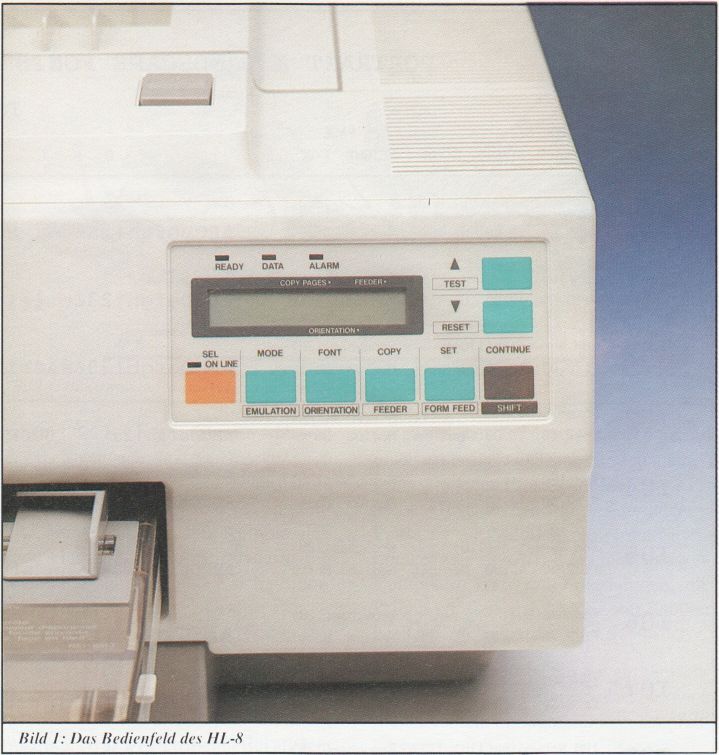 Der HL-8 besitzt nĂ€mlich gleich zwei Schnittstellen, ein serielles und eine Centronics-Interface. Bei der seriellen Ăbertragung akzeptiert der Drucker bis zu 19200 Baud.