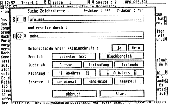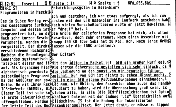 Block- und Suchoperationen sind alle von anderen Textsystemen bekannten über die Menüliste zu erreichen,wobei die Dialogboxen bei den Suchfunktionen denen von Tempus weitgehend entsprechen. Die Druckeranpassung, man höre und staune, erfolgt mit Hilfe von .CFG-Dateien. CFG-Dateien sind Druckeranpassungen, die von Ist-Word benutzt werden. Sind also für Ist-Word, in mühseliger Kleinarbeit, alle Sonderzeichen des ST auf Ihren Drucker per Graphik angepaßt, kann der GFA-Assembler diese auch aufs Papier bringen.