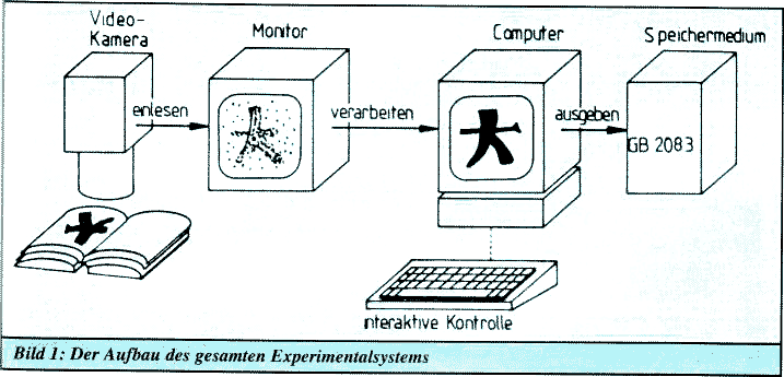 Bei beiden Systemen steht am Anfang eine CCD-Videokamera Siemens, die eine gedruckte Vorlage aufnimmt. Ein Buch, eine Zeitschrift oder sehr saubere Handschrift wird unter die Kamera gelegt, die dann das Videobild an einen Digitizer schickt. Den gesamten Aufbau des Experimentalsystems sehen Sie in Bild 1.