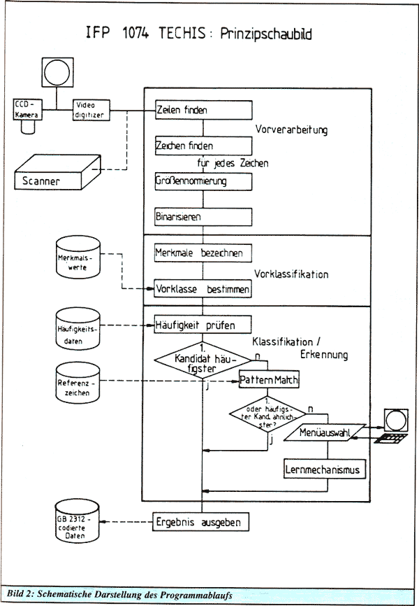 Schon ein einmaliger Lernvorgang kann beim nächsten Auftreten des selben Zeichens eine automatische Erkennung bewirken. Je mehr Lernvorgänge vorgenommen werden, umso höher ist die Erkennungsrate des Systems. Seine Stärken werden also nicht nur vom eigentlichen Programm, sondern auch von Umfang und Qualität der verwendeten Referenzbibliothek ausgemacht. Den schematischen Programmablauf sehen Sie in Bild 2 abgebildet.
