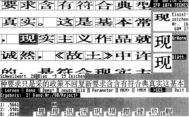 Läßt sich an dieser Stelle immer noch kein Zeichen als Ergebnis ausgeben, muß der Benutzer in einer Menüauswahl das Ergebnis festlegen. An dieser Stelle kann ein Lernmechanismus in Gang gesetzt werden, bei dem die Referenzbibliothek erweitert wird.
