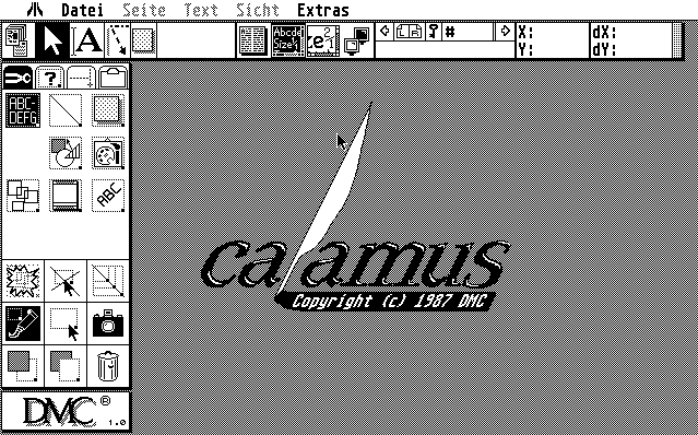 In der jetzigen Ausführung von Calamus kann man keine Vektor- oder Rastergrafiken erzeugen; dies bleibt der Anfang ’89 erscheinenden Profi-Version vorbehalten. Es ist jedoch möglich, fremde Grafiken einzulesen. Dabei kann Calamus zahlreiche File-Formate lesen: Bei Vektorgrafiken sind ein DMC-eigenes und das GEM-Metafile-Format implementiert, so daß auch auf dem PC erstellte Vektorgrafiken übernommen werden können. Rastergrafiken können ebenfalls in DMC-eigenem Format oder aber in Degas-, STAD-, STAD-Block-, GEM-Image-, GFA-Block- oder IFF-/Degas-Blockformat gelesen werden.