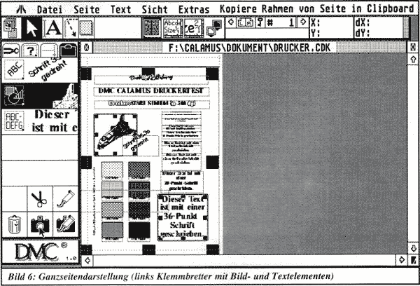 Calamus kann eine Textseite so verkleinern, daß sie komplett auf den Bildschirm paßt. Man kann dann zwar nicht mehr viel lesen, aber bekommt einen Eindruck vom Gesamtlayout. In Normaldarstellung wird ein Seitenausschnitt in Druckergröße gezeigt. Auch doppelte ‘Originalgröße' ist möglich, eine weitere Option erlaubt es, einen beliebigen anderen voreingestellten Wert zu verwenden. Der Bildaufbau ist ähnlich schnell/langsam wie bei der Konkurrenz, sehr groß ist der Unterschied nicht. Manchmal muß man eben warten.
