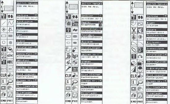 Überaus nützlich ist auch die Möglichkeit, sich den ganzen DIN A4-Schirm auf Tastendruck verkleinert anzeigen zu lassen. Einige Menüpunkte sind zusätzlich über eine Taste zu erreichen und müssen nicht per Maus angewählt werden, was in manchen Situationen sehr brauchbar ist. Auch kann der Benutzer mit einem kleinen Rechteck beliebige Muster ausschneiden und so mühelos selbst definieren.