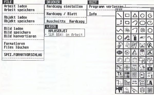 Die Anzahl der Bildschirme ist vom Speicher des ATARI STs abhängig. Auf einem 1040ST mit einem Megabyte gibt es maximal 14 Bildschirme (640x400), bei 2MB werden es 44 und bei 4MB müßten theoretisch 104 Schirme zur Verfügung stehen. Die ersten beiden sind immer zu einem verschiebbaren Ganzseiten-DIN A4-Schirm zusammengefaßt. Bei 512 KB bleibt nur der ganzseitige Screen übrig. Bilder können entweder komprimiert oder im Screen- bzw. DIN-Format abgespeichert werden. Ferner kann der Benutzer auch Objekte einzeln in Rechteckform ausschneiden und speichern bzw. später wieder einfügen, die sich leicht mit GFA-BASIC einladen lassen.