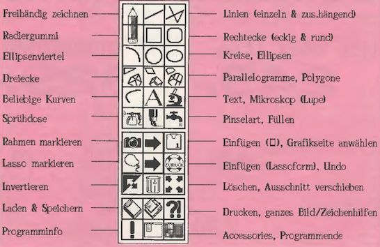 Wer andere Malprogramme (STAD, DEGAS, usw.) bereits gewohnt ist und immer noch gerne damit arbeitet, wird sich umstellen müssen. Die Bedienung des Programmes ist anfangs ziemlich ungewohnt, was sich nach längerer, intensiver Bedienung sicherlich ändert (bei uns waren zwei Wochen nicht lange genug). Dies fängt schon bei der Belegung der Maustasten an: mit der RECHTEN Taste wird etwas ausgeführt, mit der LINKEN nicht. Auch die Einstellung der Attribute über die ATTR-Funktion ist gewöhnungsbedürftig.