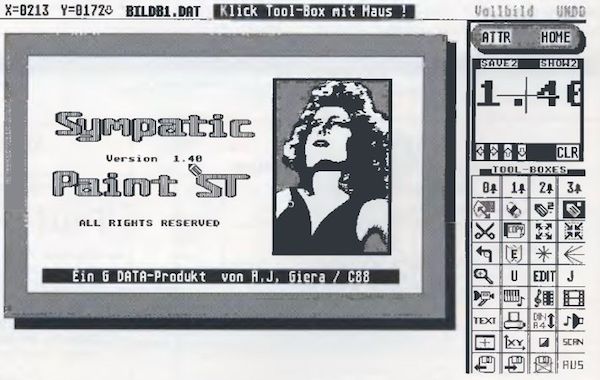 An Bildformaten liest das Zeichenprogramm STAD-gepackt, Screen- und Degas-Format genauso ein wie auch Doodle-Bilder (DIN A4). Beim Speichern kann der Benutzer zwischen Screen, Degas und GEM-Image (*.IMG) wählen. Damit dürfte der Grafiker für die wichtigsten Programme gerüstet sein. Sympatic Paint stellt dem eifrigen Zeichner übrigens bei einem Megabyte 18 Bilder zur Verfügung (640x384 Punkte - A5 ohne Menüzeile). Bei einem ATARI MEGA ST mit mehr Speicher kann sich die Zahl bis auf 99 erhöhen. Es wäre sicherlich besser, nur 95 Bilder zu bieten, dafür aber nicht bei jedem Bild die oberen 16 Punkte abzuschneiden, womit das gleiche Problem wie bei Lavadraw zu beklagen wäre (s.o.).