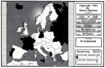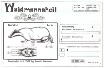 Zum einen stellt sich das Programm Erdkunde vor, das sich zur Aufgabe gemacht hat, das Geographiewissen des Lernenden aufzubessern. Hierzu verfügt das Programm über die Möglichkeit. Deutschland (59 Städte), Europa (33 Länder), USA (50 Staaten) und die Welt (46 Länder) nach Städten und Ländern abzufragen. Bei der Abfrage kann auch eine Hilfestellung gegeben werden; die schon gefragten Länder werden markiert. Das zweite Programm, wendet sich an den Kreis der Jäger und Jagdfreunde, dient nicht nur zur Vorbereitung auf die Jägerprüfung, sondern auch für alle Freunde der Jagd, die ihren waidmännischen Wissenshorizont erweitern wollen. Überzeugen dürften bei diesem Produkt vor allem die hervorragenden Tiergrafiken im hochauflösenden Grafikmodus. Beide Programme werden von Baumann Computer vertrieben und kosten 49.-DM.