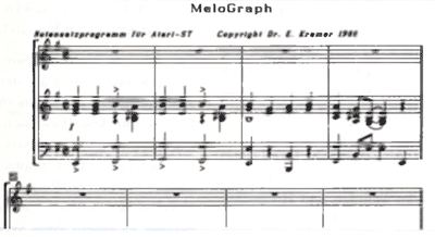 Melograph ist ein Programm, mit dem professionelle Druck Vorlagen erstellt werden können. Im Gegensatz zu anderen Programmen arbeitet MELOGRAPH nicht mit Nadeldruckern, sondern mit (HP-GL-kompatiblen) Plottern, dadurch wird ein absolut scharfes Notenbild erzielt, was seinesgleichen sucht. Mit dem Editor werden die Noten Stimme für Stimme über die Tastatur eingegeben, wobei ein Eingabecode verwendet wird. der sehr leicht verständlich ist. Mit dem Hauptprogramm wird die Papiergröße, die Rastralgröße, die Anzahl der Notenzeilen und Systeme sowie die Anzahl der darzustellenden Stimmen und Takte für die aktuelle Seite festgelegt. Die Stimmen werden von Diskette gelesen, der Zeilenumbruch und das Layout erfolgen automatisch. Am Bildschirm können nun Bögen, Vortragsbezeichnungen, Text usw. mit der Maus eingefügt werden. Die fertig erstellte Seite kann abgespeichert oder direkt geplottet werden. Der Preis dieses professionellen Programms wird sich auf ca. 3400.- DM belaufen.
