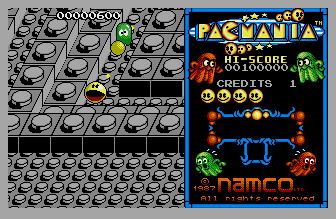 Pac Man ist einer der erfolgreichsten Charaktere in der Computer- und Videospielgeschichte. Mit dem gleichnamigen Automaten machte ATARI einen großen Reibach in den Spielhallen, sehr erfolgreich war auch das Spiel für die ATARI-VCS Konsole. In sämtlichen Variationen gibt es den Meinen, gelben Punktefresser auch auf allen Homecomputersystemen. Dann wurde es eine ganze Zeit lang still um Mr. Pac Man. Jetzt feiert er in "Pac Mania" ein ruhmvolles Comeback. Genau wie beim Original-Pac Man muß der Spieler den Helden durch Labyrinthe steuern und alle gelben Punkte auffressen, um in das nächste Labyrinth gelangen zu können. Dabei wird er von Geistern verfolgt, deren Berührung für den Verlust eines Bildschirmlebens sorgt. Durch das Auffressen von Kraftpillen kann Pac Man die Geister fressen. Manchmal liegen Früchte oder andere Gegenstände im Labyrinth, die Bonuspunkte bringen. In Pac Mania gibt es noch ein paar zusätzliche Features. Druckt man auf den Feuerknopt kann Pac Man hüpfen. Das ist manchmal von großem Vorteil. Ist man beispielsweise von Geistern umzingelt, springt man einfach über die Köpfe der Geister, und die Situation ist gerettet. Am auffälligsten ist an Pac Mania die Tatsache, daß sich das Labyrinth in 3D-Darstellung präsentiert. Die Grafik ist im Vergleich zum original Pac Man wesentlich verbessert worden.